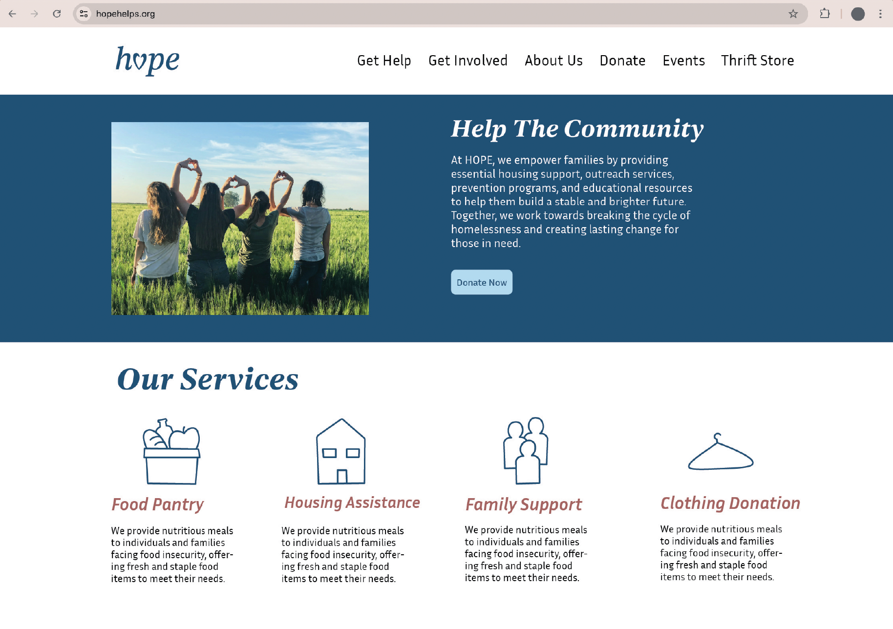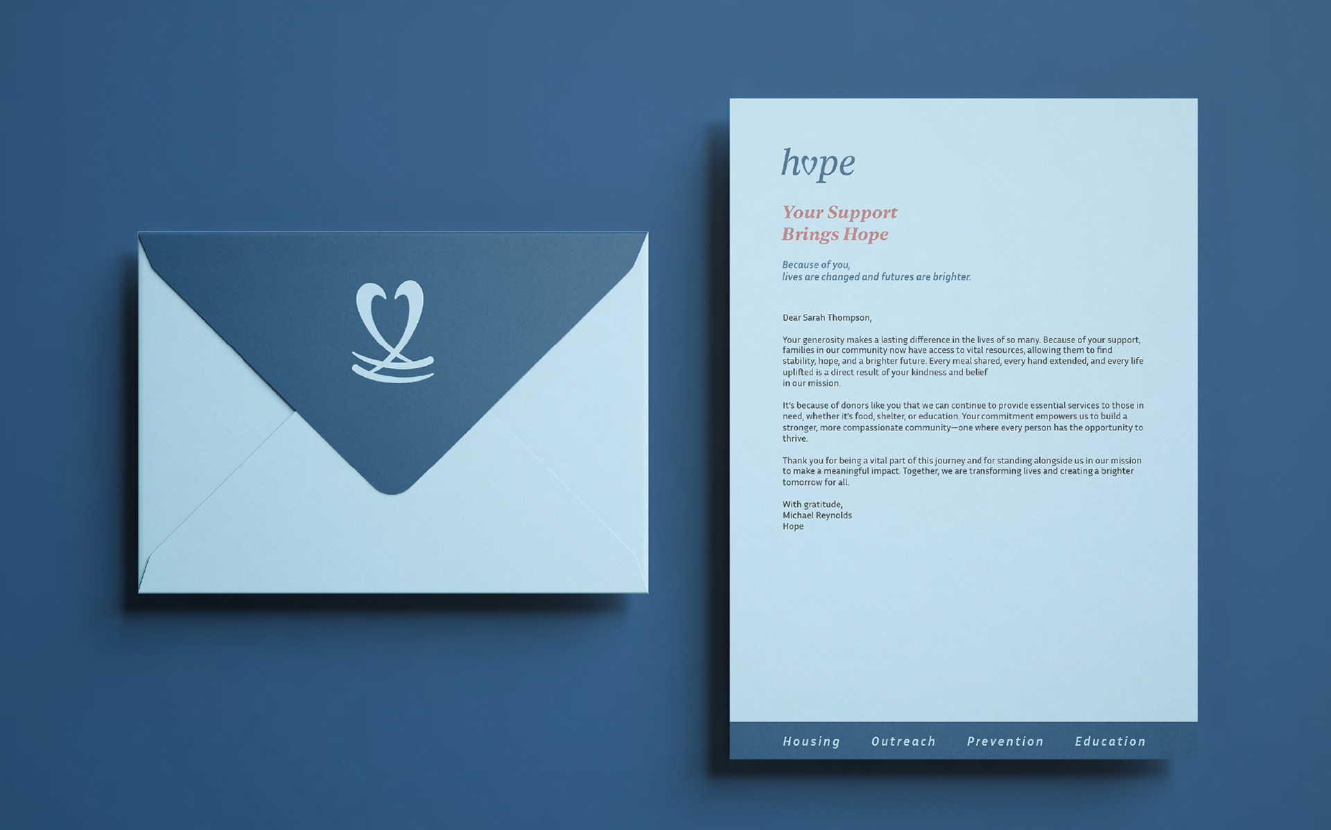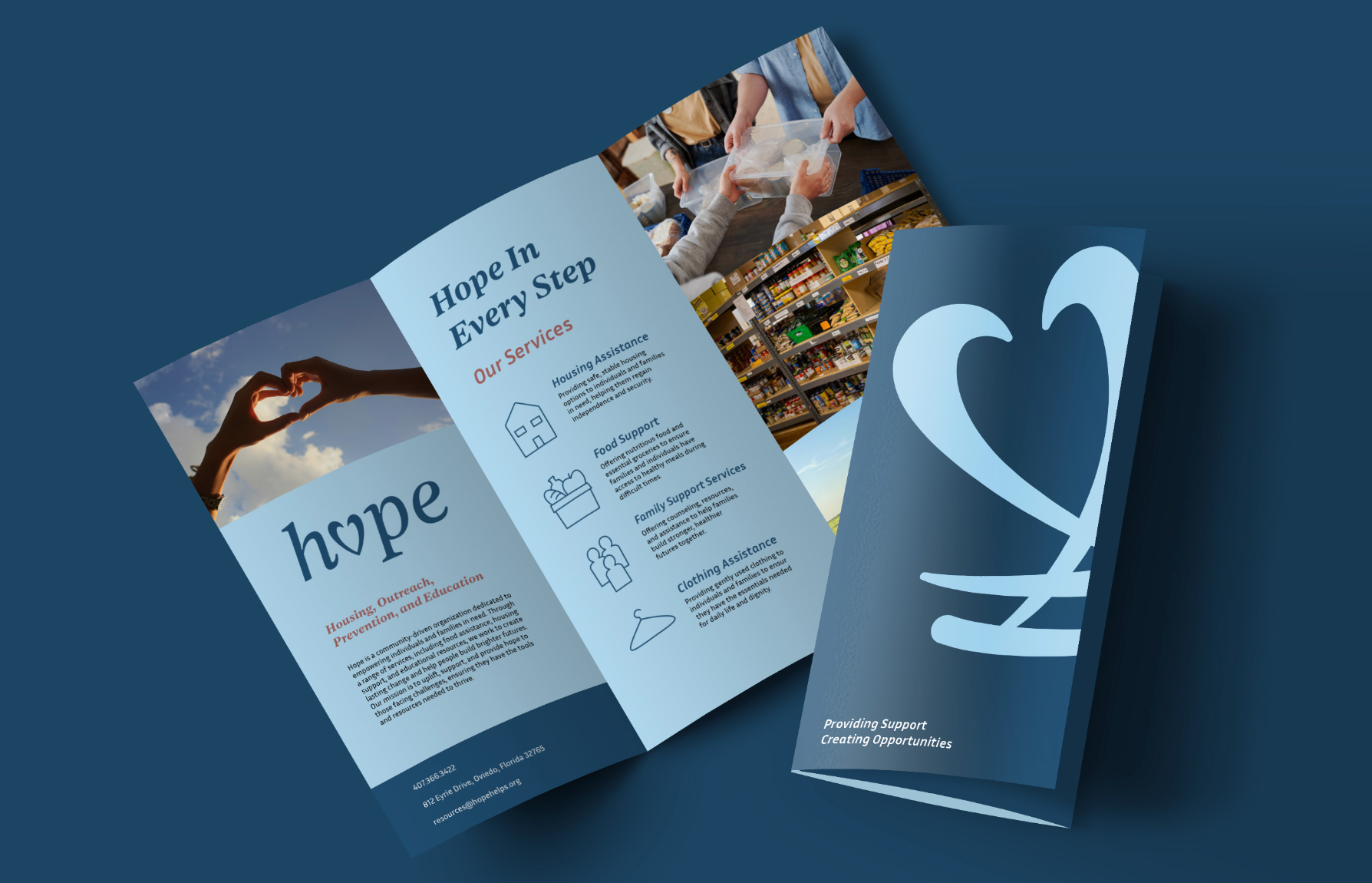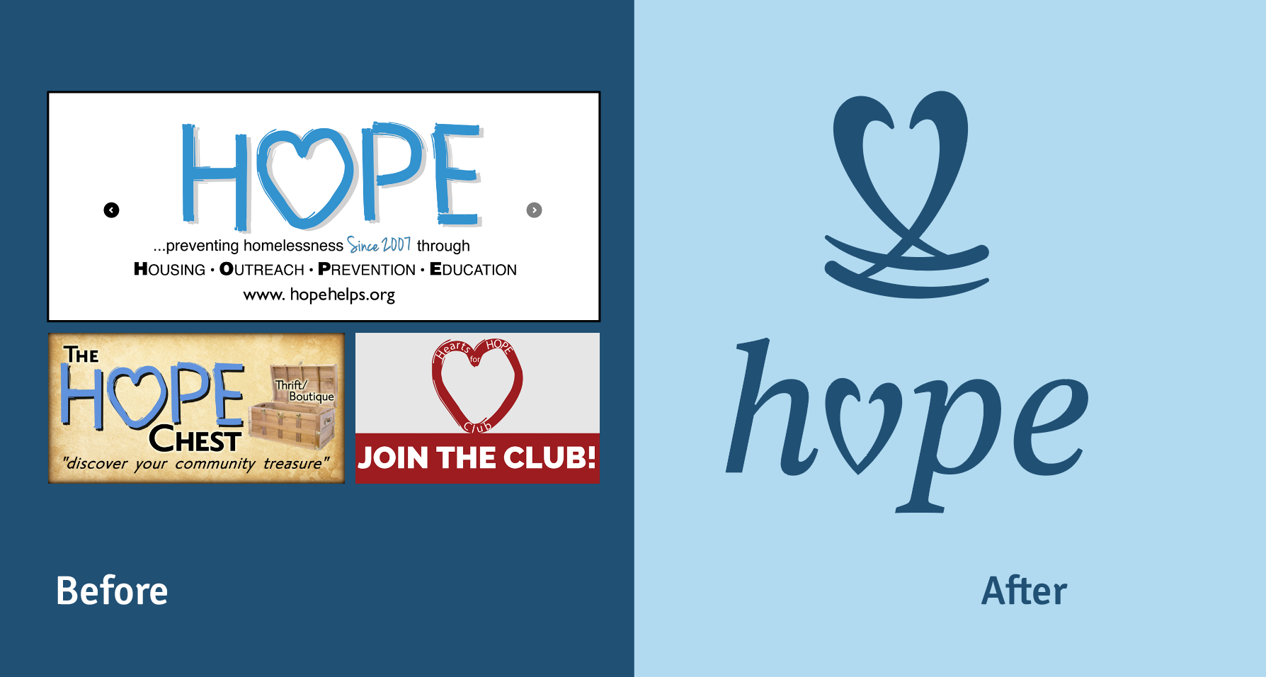 HOPE is a nonprofit that helps prevent homelessness and supports at-risk families with food, housing, and education. This re-brand brings clarity and warmth to the organization’s mission, creating a visual system that reflects stability, compassion, and long-term support